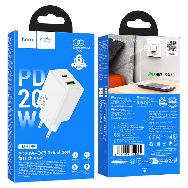 Φορτιστής Ταξιδίου Hoco N69 Nuevo PD20W 5V QC3.0A με 2 Εξόδους Φόρτισης 1xUSB-C και 1xUSB-A Λευκός