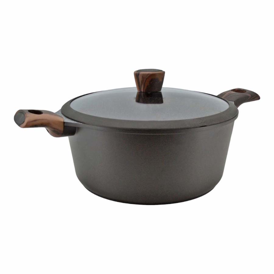 Κατσαρόλα κατασκευασμένη από χυτό αλουμίνιο συνδυάζει αντοχή με απόλυτη απόδοση για εκπληκτικά μαγειρικά αποτελέσματα. Η εσωτερική επιφάνεια διαθέτει τριπλή αντικολλητική επίστρωση πέτρας εξασφαλίζοντας αντοχή σε υψηλές θερμοκρασίες και γδαρσίματα. Διαθέτει γυάλινο πυράντοχο καπάκι το οποίο περιβάλλεται από στεφάνι σιλικόνης. Έχει ενισχυμένη εξωτερική επιφάνεια σε σκούρο καφέ χρώμα και βιομηχανικό πάτο για ομοιόμορφη κατανομή της θερμότητας. Οι λαβές της είναι από αντιολισθητικό βακελίτη soft touch σε όψη ξύλου προσφέροντας άνεση κατά τη χρήση και αντιθερμική προστασία. Επιπλέον, είναι κατάλληλη για όλες τις εστίες, συμπεριλαμβανομένων και των επαγωγικών. Τέλος, είναι ασφαλές για χρήση στο πλυντήριο πιάτων, καθιστώντας εύκολη την καθημερινή φροντίδα. Πάχος 1,6/4,0mm