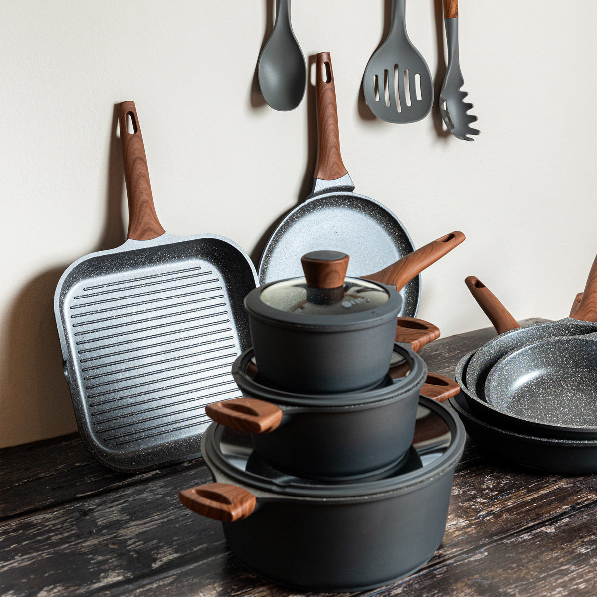 Ανακαλύψτε τα τηγάνια Stone Series! Είναι κατασκευασμένα από χυτό αλουμίνιο υψηλής ποιότητας και αντοχής, ενώ διαθέτουν πιστοποίηση Cookmark προσφέροντας μοναδικές αντικολλητικές ιδιότητες σε κάθε χρήση. Η εξωτερική επίστρωση με όψη πέτρας και το μοναδικό design τους θα ανανεώσουν την κουζίνα σας. Περιλαμβάνουν εργονομική και αντιολισθητική λαβή βακελίτη που παραμένει κρύα κατά το μαγείρεμα. Η σειρά μαγειρικών σκευών Stone Series προσφέρει ομοιόμορφη κατανομή θερμοκρασίας και διατήρηση θερμότητας κατά μήκος του σκεύους. Έτσι μπορείτε να μαγειρεύετε διατηρώντας αναλλοίωτες τις θρεπτικές ουσίες του γεύματος σας και εξοικονομώντας ενέργεια