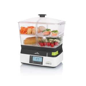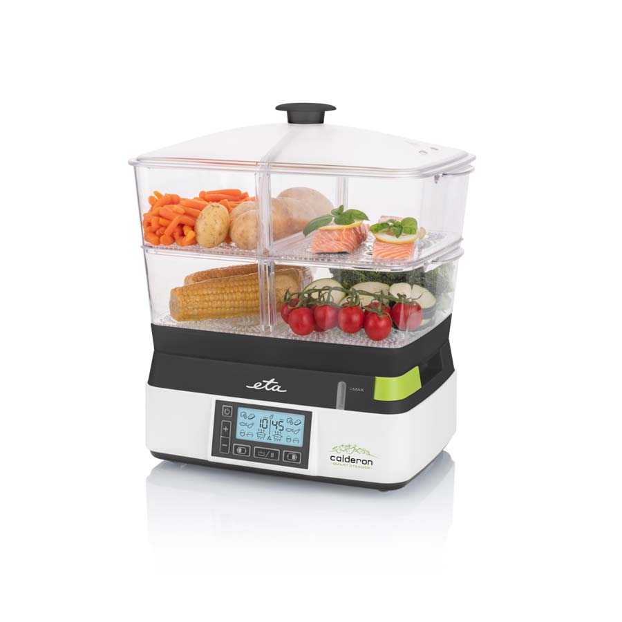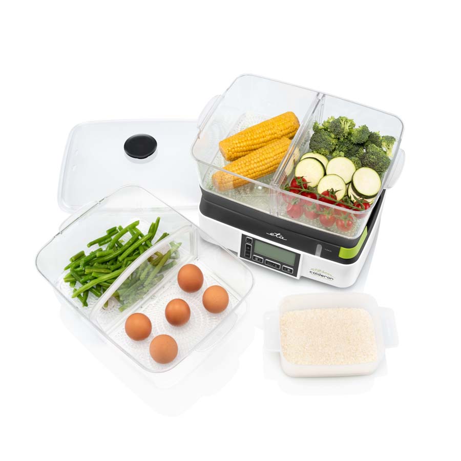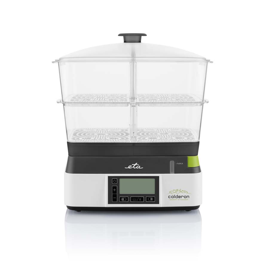 Ο ατμομάγειρας ETA Calderon II με 2 διαφανή δοχεία διευκολύνει το υγιεινό μαγείρεμα. Η συνολική χωρητικότητα των 11 λίτρων είναι αρκετά γενναιόδωρη για να προετοιμάσετε ένα οικογενειακό γεύμα, αλλά ταυτόχρονα μαγειρεύει τόσο γρήγορα που θα χαρείτε να τον χρησιμοποιήσετε ακόμα κι αν ετοιμάζετε ένα γεύμα μόνο για εσάς.