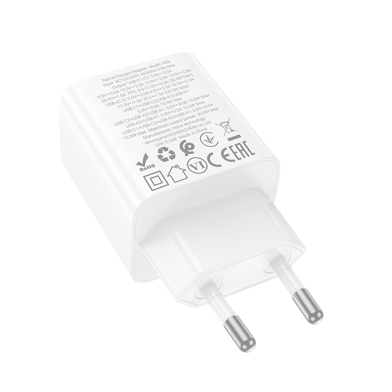 Φορτιστής Ταξιδίου Hoco N56 Fundador GaN με 4 Εξόδους Φόρτισης 2xUSB-C PD30W + 2x USB-A QC3.0A Λευκός