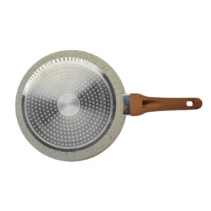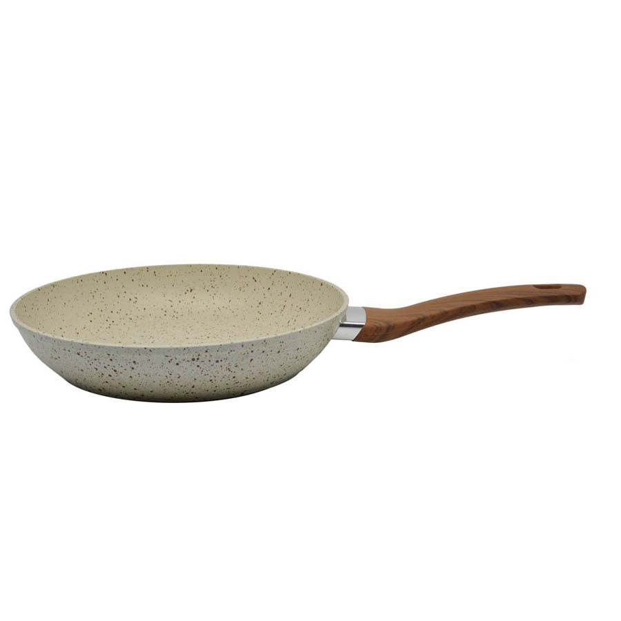 Τηγάνι αλουμινίου με όψη μπεζ πέτρας,με διπλή αντικολλητική επίστρωση εσωτερικά και βιομηχανικό πάτο.Διαθέτει εργονομική αντιολισθητική λαβή από βακελίτη με όψη καφέ ξύλου. Είναι κατάλληλο για όλες τις εστίες κ ασφαλή για πλύσιμο στο πλυντήριο πιάτων.