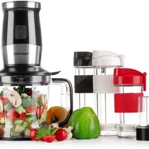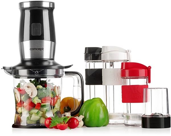 - Σετ μπλέντερ + τεμαχιστής 1200 ml με διπλό μαχαίρι + λειαντήρα για καρυκεύματα και καφέ + 3 δοχεία ανάμιξης με καπάκι με θηλιά και διπλή σφράγιση : 570 ml λευκό, 570 ml πράσινο και 400 ml κόκκινο
