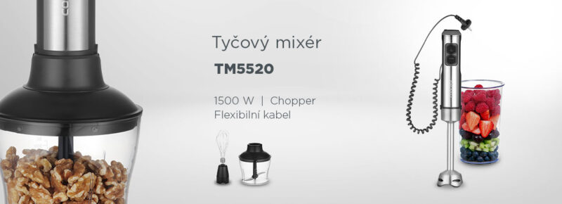 Μπορείτε να χειριστείτε άνετα το μπλέντερ χειρός TM5520 με το ένα χέρι. Τα σχεδιαστικά φωτιζόμενα κουμπιά προσφέρουν δυνατότητα επιλογής δύο λειτουργιών με δυνατότητα συνεχούς ρύθμισης της ταχύτητας . Χάρη στην εργονομικά διαμορφωμένη λαβή, το μπλέντερ κρατιέται εύκολα. Είναι επίσης πολύ εύκολο να αλλάξετε αξεσουάρ με ένα κουμπί. Όλα τα μέρη του μίξερ που έρχονται σε επαφή με τις πρώτες ύλες είναι κατασκευασμένα από υψηλής ποιότητας ανοξείδωτο χάλυβα. Μπορείτε να πλύνετε τα μεμονωμένα δοχεία και τα μαχαίρια κοπής στο πλυντήριο πιάτων.