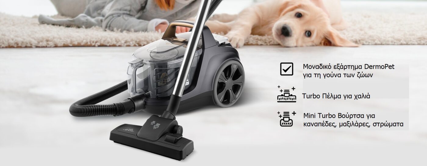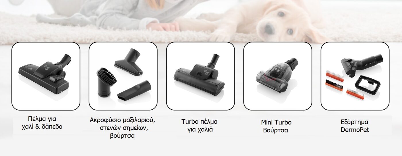 - Turbo πέλμα για πιο αποτελεσματικό καθάρισμα των χαλιών – Διαθέτει στρόβιλο αέρα και περιστρεφόνενη βούρτσα που “χτενίζει” το χαλί, έτσι συλλέγει αποτελεσματικά τα μαλλιά και τις τρίχες των ζώων