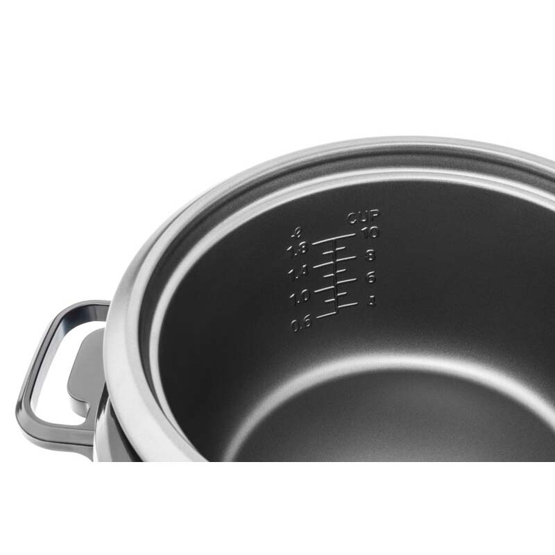 Το δοχείο αλουμινίου με αντικολλητική επιφάνεια με μέγιστο όγκο 1,8 l μπορεί να χωρέσει έως και 1,2 kg ομού ρυζιού. Μετά το μαγείρεμα, διατηρεί αυτόματα τη θερμοκρασία , οπότε το φαγητό είναι πάντα έτοιμο για σερβίρισμα, ακόμα κι αν κάποιος πρόκειται να έρθει αργότερα για το οικογενειακό δείπνο.