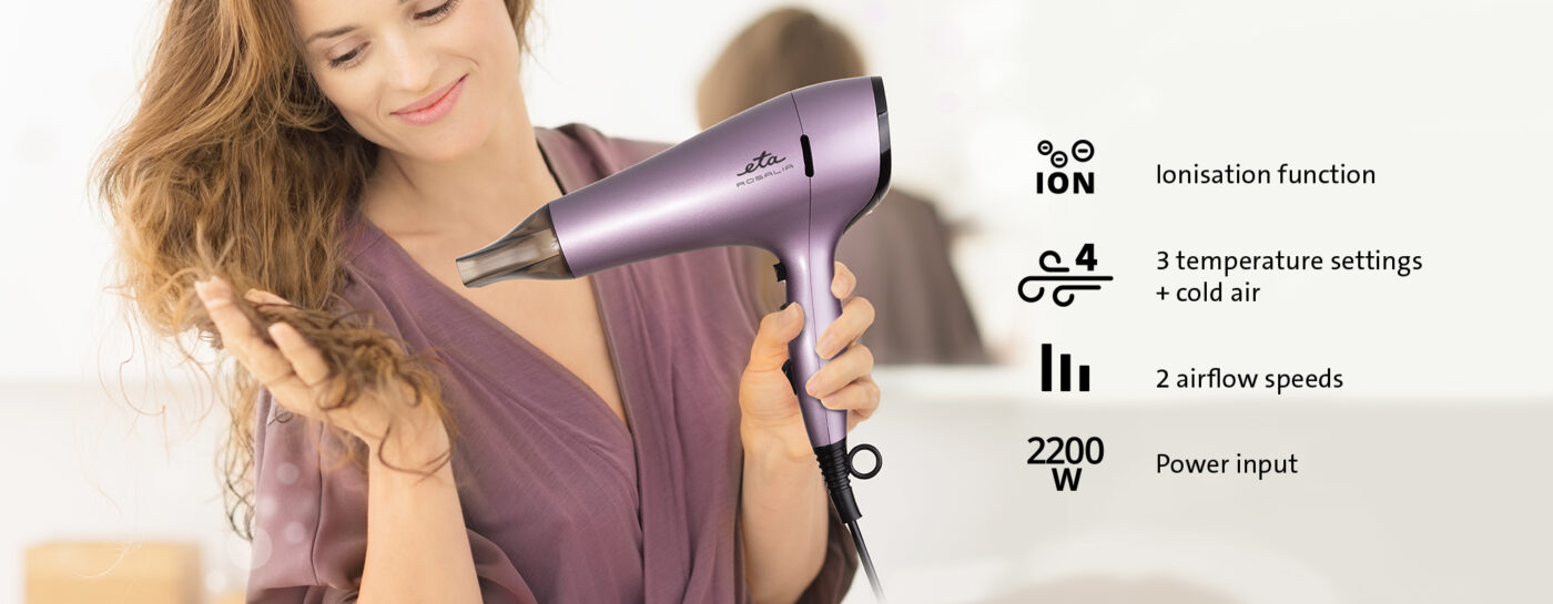 Το πιστολάκι μαλλιών ETA Rosalia είναι εξοπλισμένο με λειτουργία ιονισμού και κρύου αέρα , έτσι ώστε το χτένισμα σας να σας ομορφαίνει πολύ καιρό μετά την έξοδο από το μπάνιο.