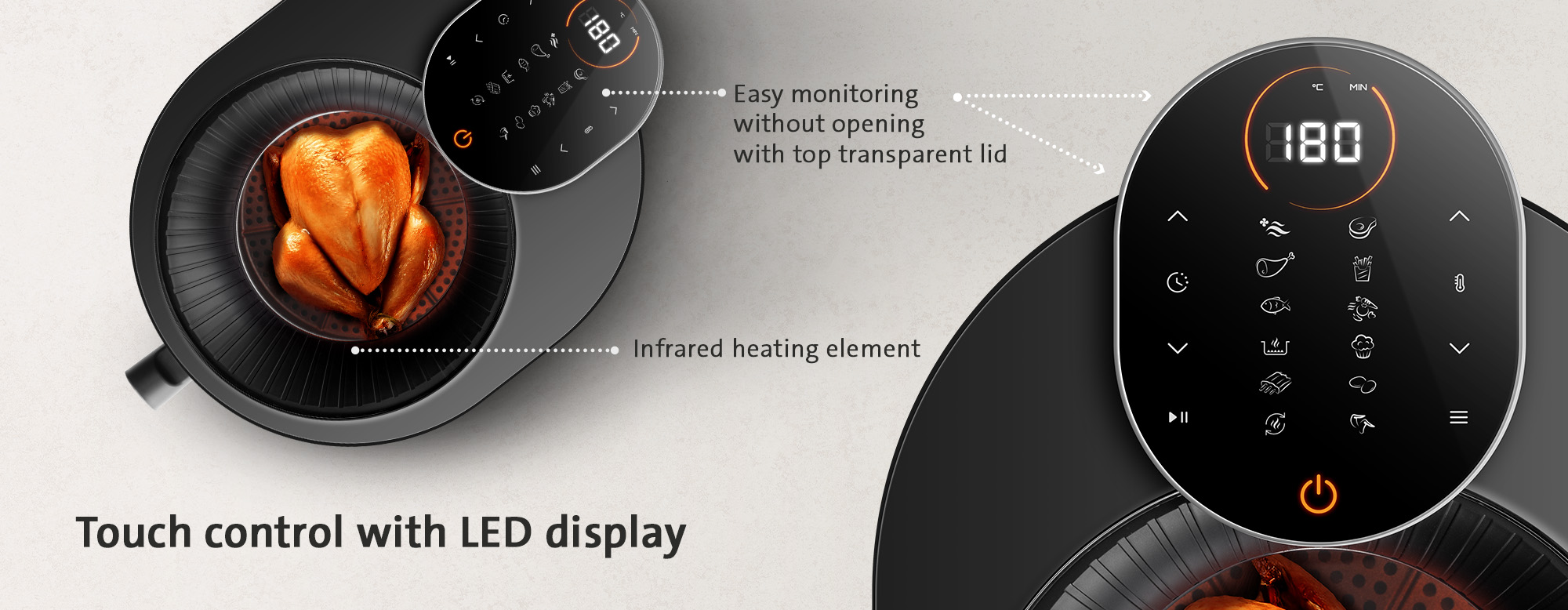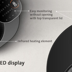 Επιπλέον, μπορείτε να ρυθμίζετε συνεχώς τη θερμοκρασία από 80 έως 200 °C και ο χρονοδιακόπτης για έως και 60 λεπτά διασφαλίζει ότι δεν θα καεί τίποτα. Το σύγχρονο χειριστήριο αφής με οθόνη LED είναι εύχρηστο και εύκολο, ώστε να έχετε πάντα μια τέλεια επισκόπηση της λειτουργίας ρύθμισης, της θερμοκρασίας και του χρόνου προετοιμασίας.