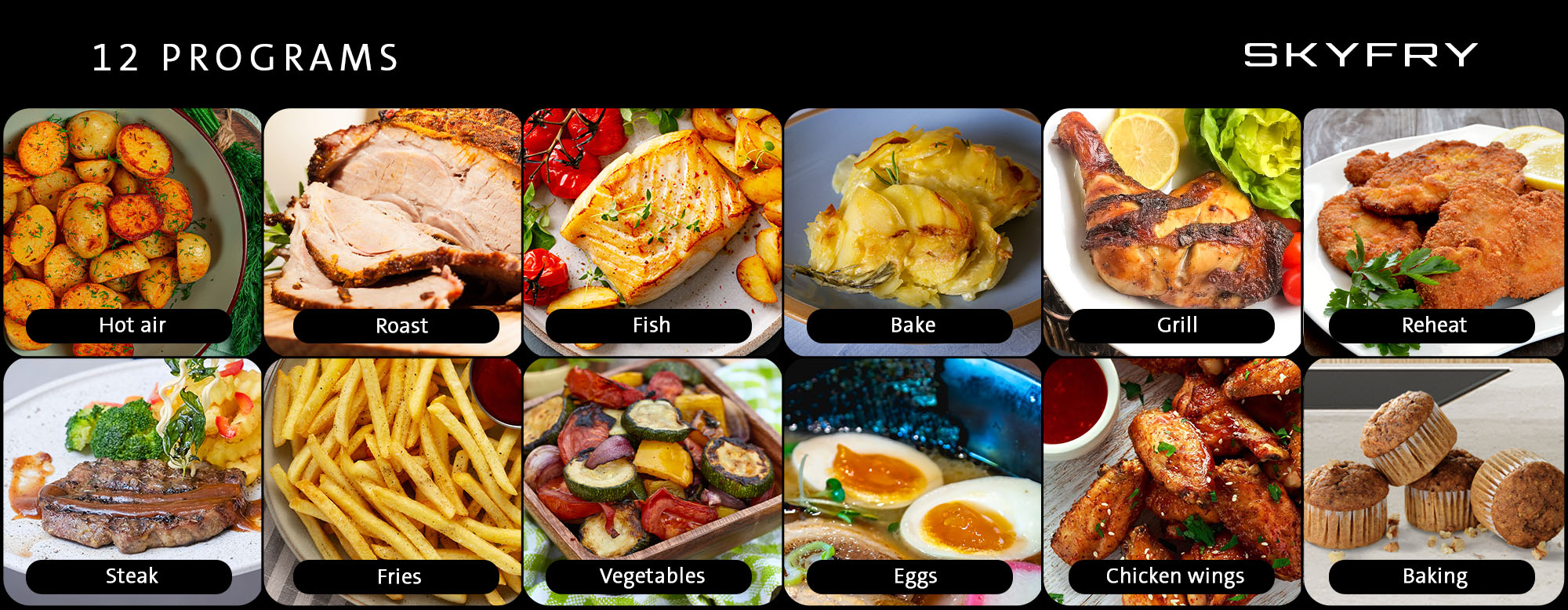 Θερμός αέρας, Ψητά, Ψάρι, Ψήσιμο στο φούρνο, Γκριλ, Ζέσταμα, Μοσχάρι, Τηγανητές πατάτες (συμπεριλαμβανομένων των κατεψυγμένων), Λαχανικά, Ψήσιμο γλυκών, αυγά και φτερούγες κοτόπουλου.