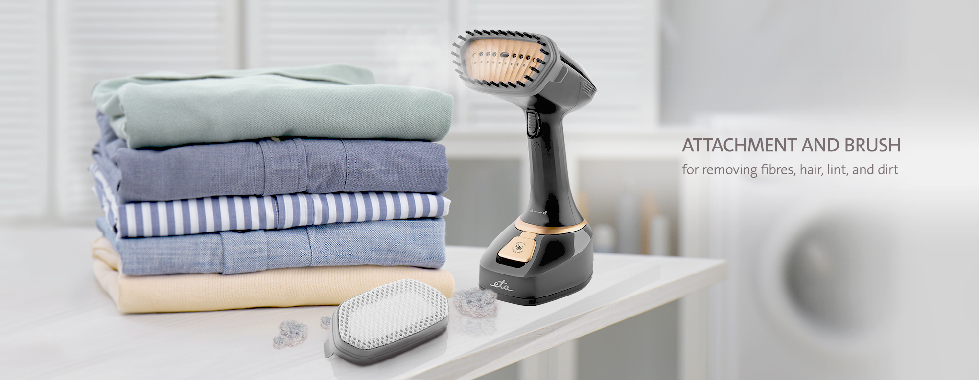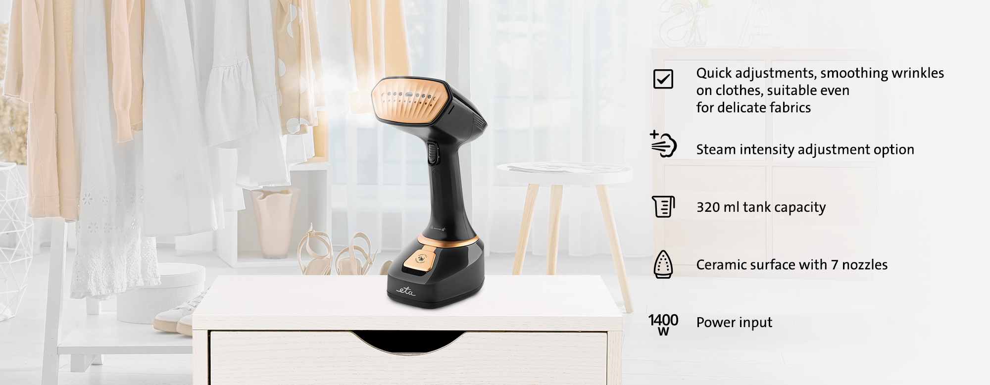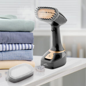 Το σύστημα ατμού χειρός ETA Stephany θα φροντίσει για το φρεσκάρισμα των ρούχων σας λίγο πριν φύγετε από το σπίτι – θα λειάνει τις ανεπιθύμητες ζάρες , θα αναζωογονήσει ορατά το ύφασμα και, χάρη σε ένα ειδικό εξάρτημα, μπορεί επίσης να αφαιρέσει βρωμιά από αυτό . Επιπλέον, ο καυτός ατμός καταστρέφει τα βακτήρια, απομακρύνει τις οσμές και είναι απαλός σε όλους τους τύπους υφασμάτων.