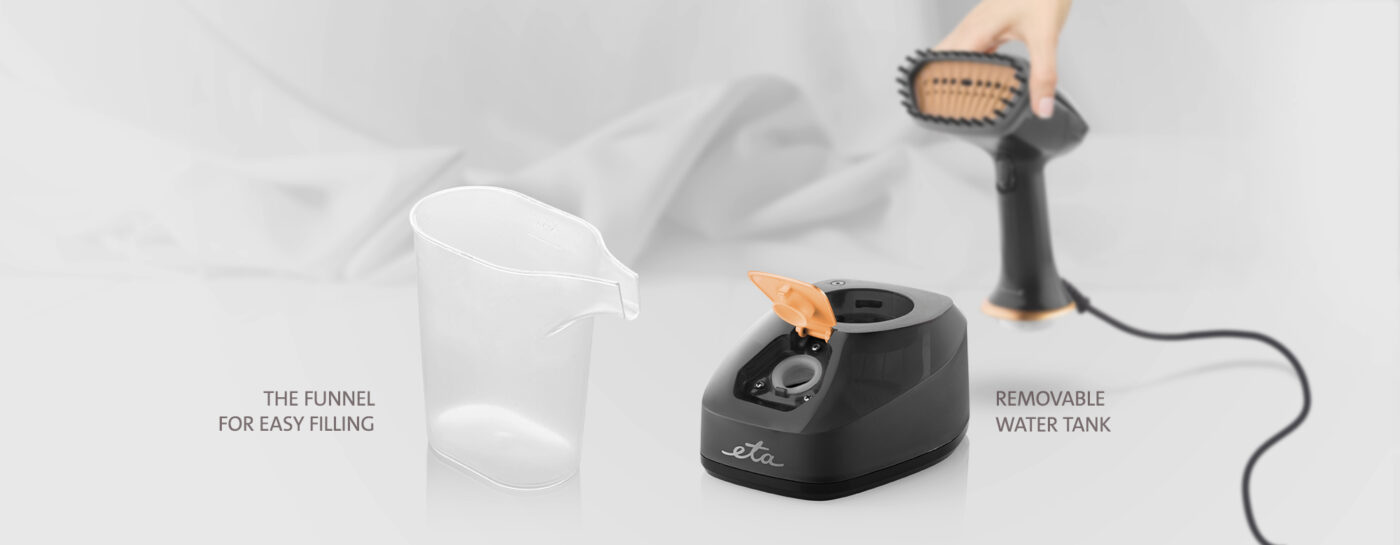 Το σύστημα ατμού ETA Stephany έχει σχεδιαστεί με έμφαση στην άνετη χρήση χωρίς περιττές επιπλοκές. Μπορείτε να γεμίσετε εύκολα την αφαιρούμενη δεξαμενή με νερό χάρη στο μεγάλο άνοιγμα και στην πρακτική χοάνη , η οποία αποτελεί μέρος της συσκευασίας. Το δοχείο μπορεί να χωρέσει έως και 380 ml νερού, το οποίο είναι αρκετό για να διαρκέσει έως και 23 λεπτά λειτουργίας .