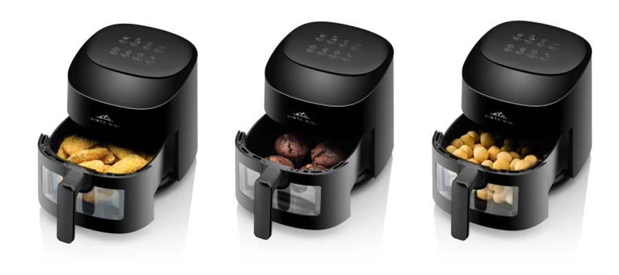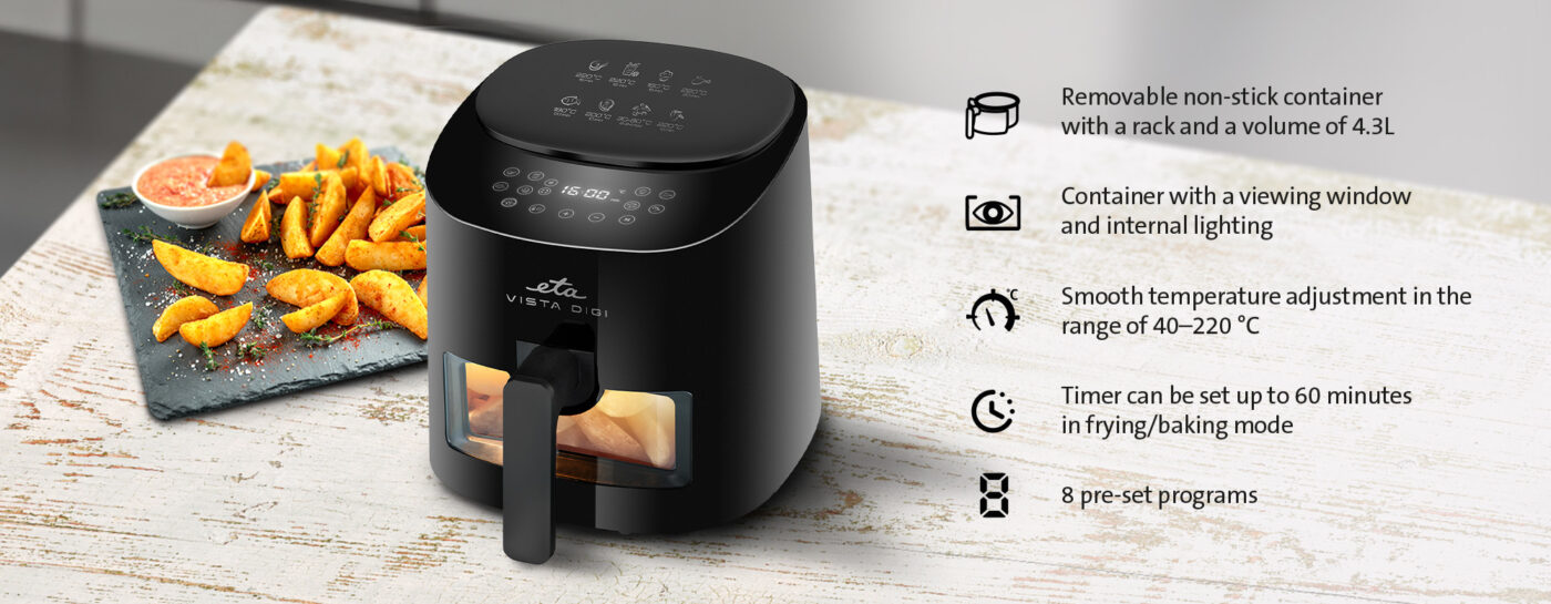 Με τη φριτέζα ζεστού αέρα ETA Vista Digi, χάρη σε 8 προκαθορισμένα προγράμματα, θα ετοιμάζετε πάντα μια τέλεια μπριζόλα, τραγανές πατάτες, ζουμερό ψάρι, αφράτο κέικ ή μπορείτε να τη χρησιμοποιήσετε ως στεγνωτήριο τροφίμων.