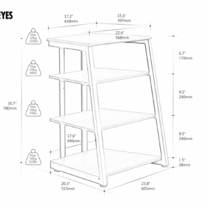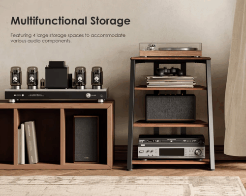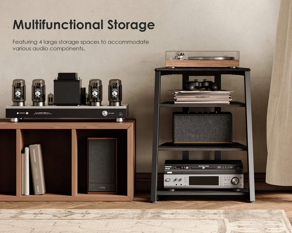 Επιπλέον, αυτή η στερεοφωνική βάση 4 επιπέδων είναι προσεκτικά σχεδιασμένη με δύο ελεύθερα ρυθμιζόμενα ράφια από laminate , για να φιλοξενεί εξοπλισμό διαφορετικού ύψους. Μπορείτε να μετακινήσετε το κεντρικό ράφι προς τα πάνω κατά 44,3 mm για να κάνετε την απόσταση 284,3 mm .