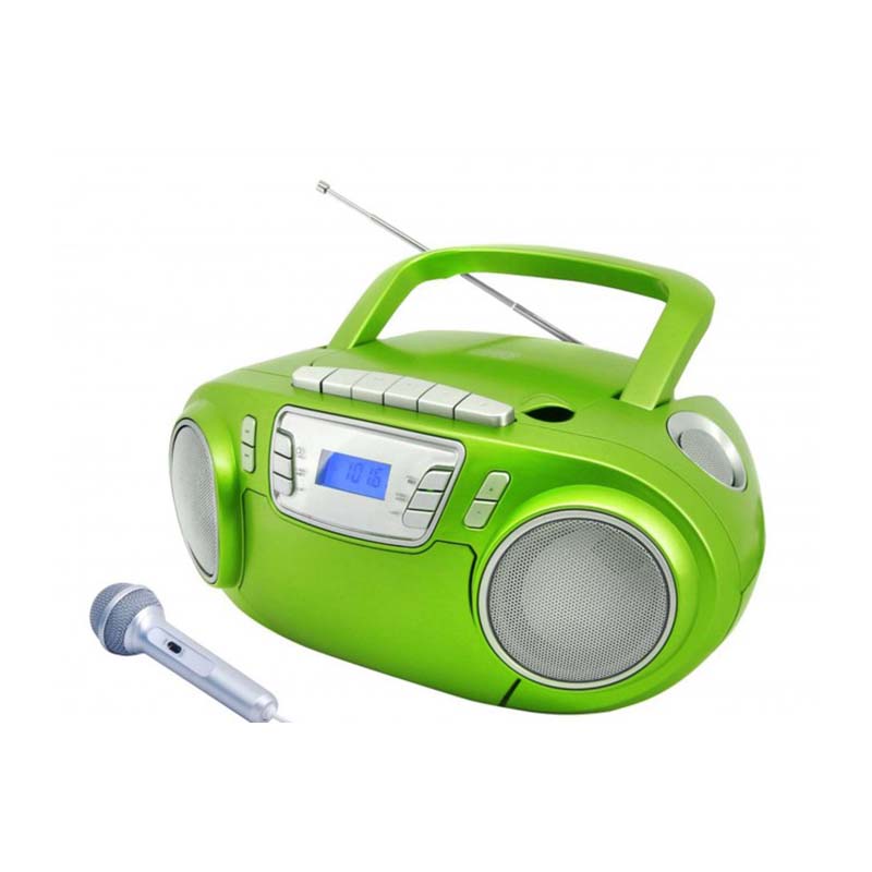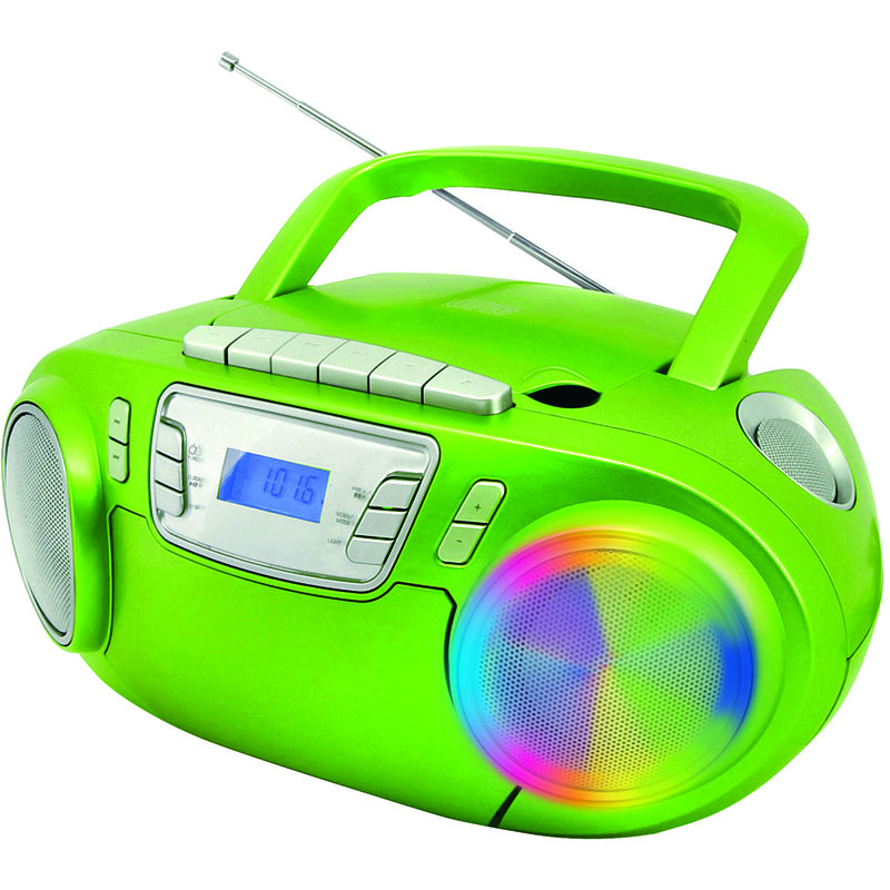 Το Soundmaster SCD5800GR σε φρέσκο πράσινο χρώμα, είναι κατάλληλο τόσο για εσωτερικούς όσο και για υπαίθριους χώρους. Με τον ενσωματωμένο φωτισμό ντισκοτέκ και μικρόφωνο που περιλαμβάνεται, αυτό το boombox θα είναι ο βηματοδότης σε οποιοδήποτε μέρος. Αυτό το boombox είναι εξοπλισμένο με CD player, ραδιόφωνο (στερεοφωνικό) και κασετόφωνο. Μοναδική σε αυτή τη συσκευή είναι η δυνατότητα εγγραφής του τραγουδιού στην κασέτα. Επιπλέον, αυτό το boombox είναι εξοπλισμένο με είσοδο USB και ακουστικών. Λόγω της άνετης λαβής και του γεγονότος ότι το SCD5800 GR λειτουργεί τόσο με ρεύμα όσο και μπαταρίες, η συσκευή αυτή μπορεί να σας συνοδέψει παντού.